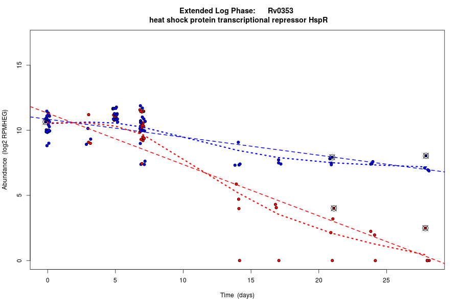 Rv0353 (HspR, transcriptional repressor of DnaK operon) is predicted to be co-regulated in modules bicluster_0402 with residual 0.39 and bicluster_0475 with residual 0.40.