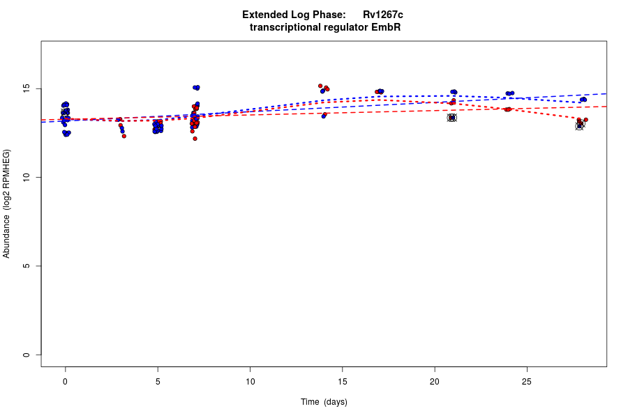 Rv1267c (Transcriptional regulatory protein EmbR) is predicted to be co-regulated in modules bicluster_0044 with residual 0.54 and bicluster_0319 with residual 0.47.