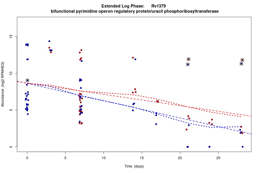 Rv1379 (Uracil phosphoribosyltransferase (EC 2.4.2.9) / Pyrimidine operon regulatory protein PyrR) is predicted to be co-regulated in modules bicluster_0137 with residual 0.49 and bicluster_0484 with residual 0.42.