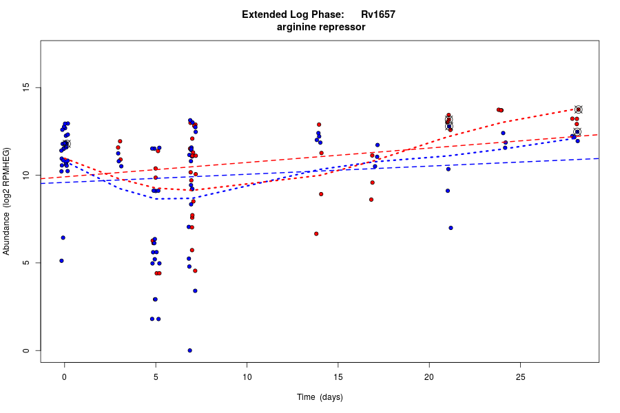 Rv1657 (Arginine pathway regulatory protein ArgR, repressor of arg regulon) is predicted to be co-regulated in modules bicluster_0521 with residual 0.55 and bicluster_0572 with residual 0.62.
