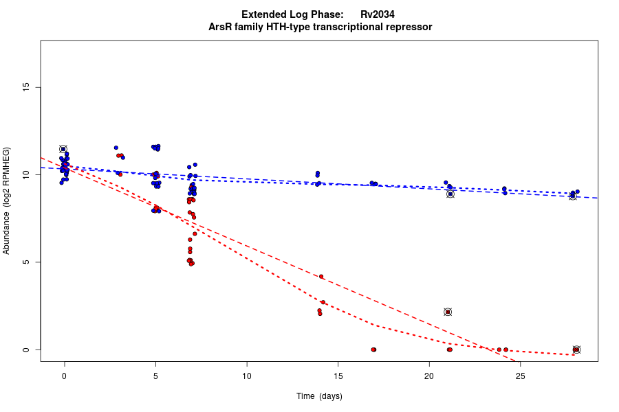 Rv2034 (Transcriptional regulator, ArsR family) is predicted to be co-regulated in modules bicluster_0120 with residual 0.55 and bicluster_0546 with residual 0.58.