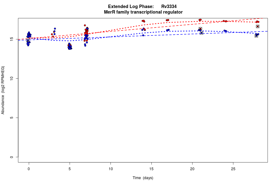 Rv3334 (Mercuric resistance operon regulatory protein) is predicted to be co-regulated in modules bicluster_0120 with residual 0.55 and bicluster_0401 with residual 0.58.