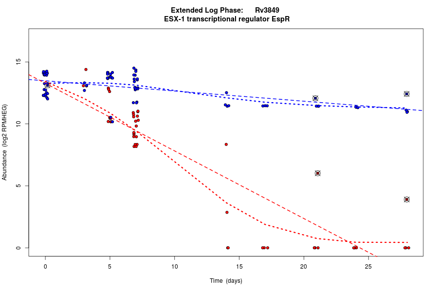 Rv3849 (ESX-1 secreted protein regulator EspR) is predicted to be co-regulated in modules bicluster_0033 with residual 0.56 and bicluster_0349 with residual 0.51.