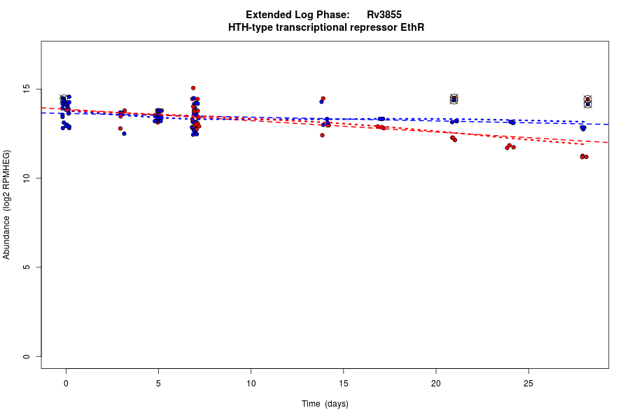 Rv3855 (Transcriptional repressor EthR, TetR family) is predicted to be co-regulated in modules bicluster_0129 with residual 0.53 and bicluster_0478 with residual 0.49.